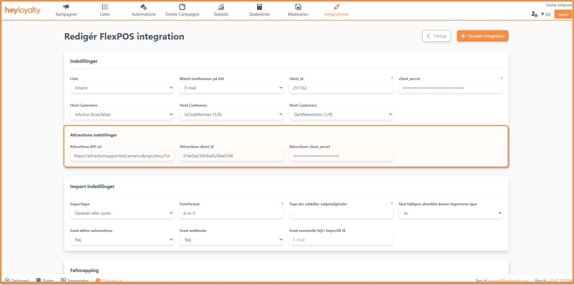 Hvis du i Amero/FlexPos sælger billetter og/eller medlemskaber, skal du under Attractions indstillinger indsætte: Attraction API url, Attraction Client_id og Attraction Client_secret. Disse oplysninger får du ved at kontakte din FlexPOS-konsulent eller deres support: