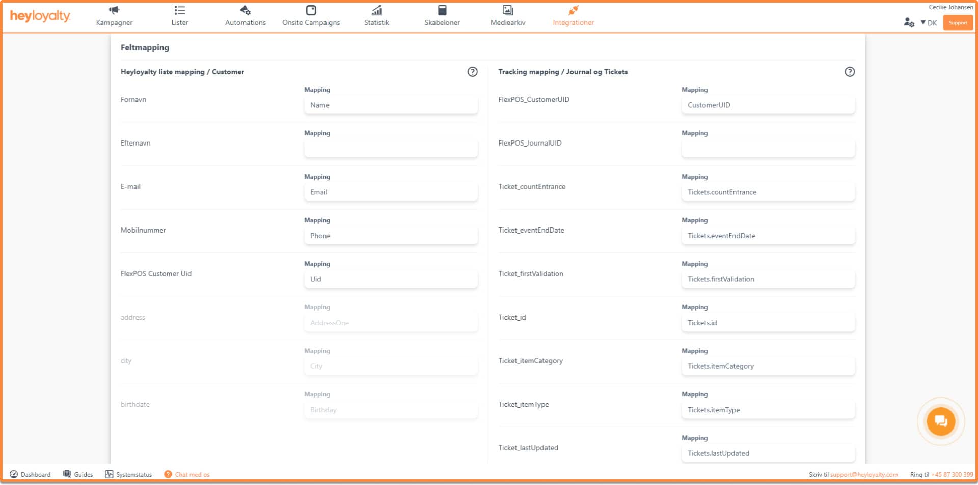 Som standard mapper vi en række felter på kunder, tickets og journals. Feltmapping kan du se nederst på integrationssiden. Hvis der er felter, du ikke bruger, eller som ikke er aktive på din liste eller tracking, kan du vælge at fjerne dem i Heyloyaltys feltmapping.