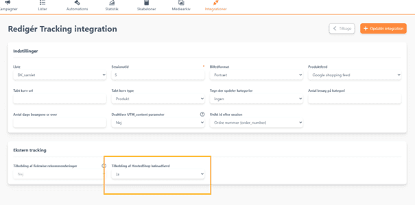 Når du har indsat værdierne, kan du gå ind under din Tracking eller Tabt kurv-trigger og på indstillinger-knappen (de tre prikker) vælger du ”Redigér Tracking”. Nederst under ”Ekstern tracking, sætter du ”Tilkobling af HostedShop købsadfærd” til ”Ja”.