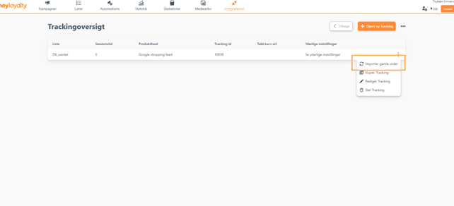 Ude på oversigten kan du vælge "Importér gamle ordrer". På de tre prikker, kan du vælge ”Importér gamle ordre”. Hvis du allerede opsat automations, der reagerer på købsadfærd, og ikke har importeret bagudrettet data endnu, skal du overveje om disse automations skal deaktiveres.