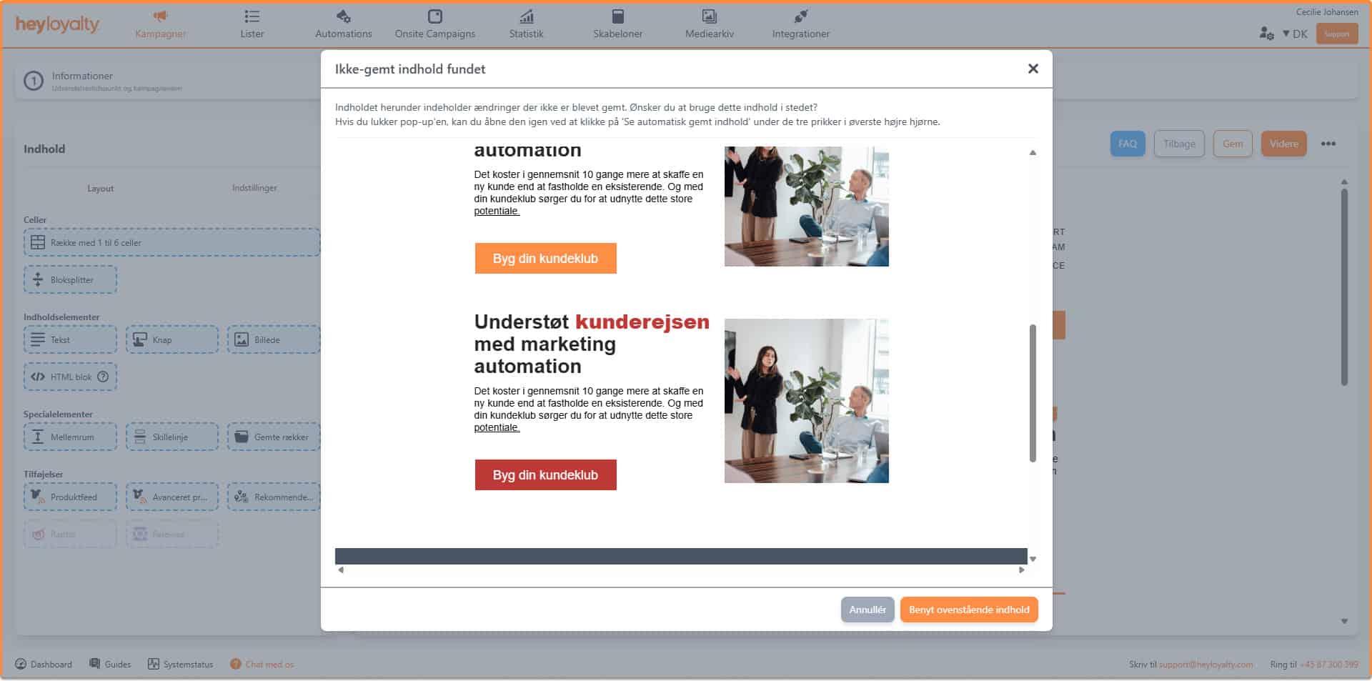 Her kan du gemme indholdet i din kampagne og tilgå dit automatisk gemte indhold. Vi gemmer automatisk hvert minut. Hvis du forlader din kampagne, efter et minut, og vender tilbage til kampagnen, vil du blive mødt af en popup som vist nedenfor.