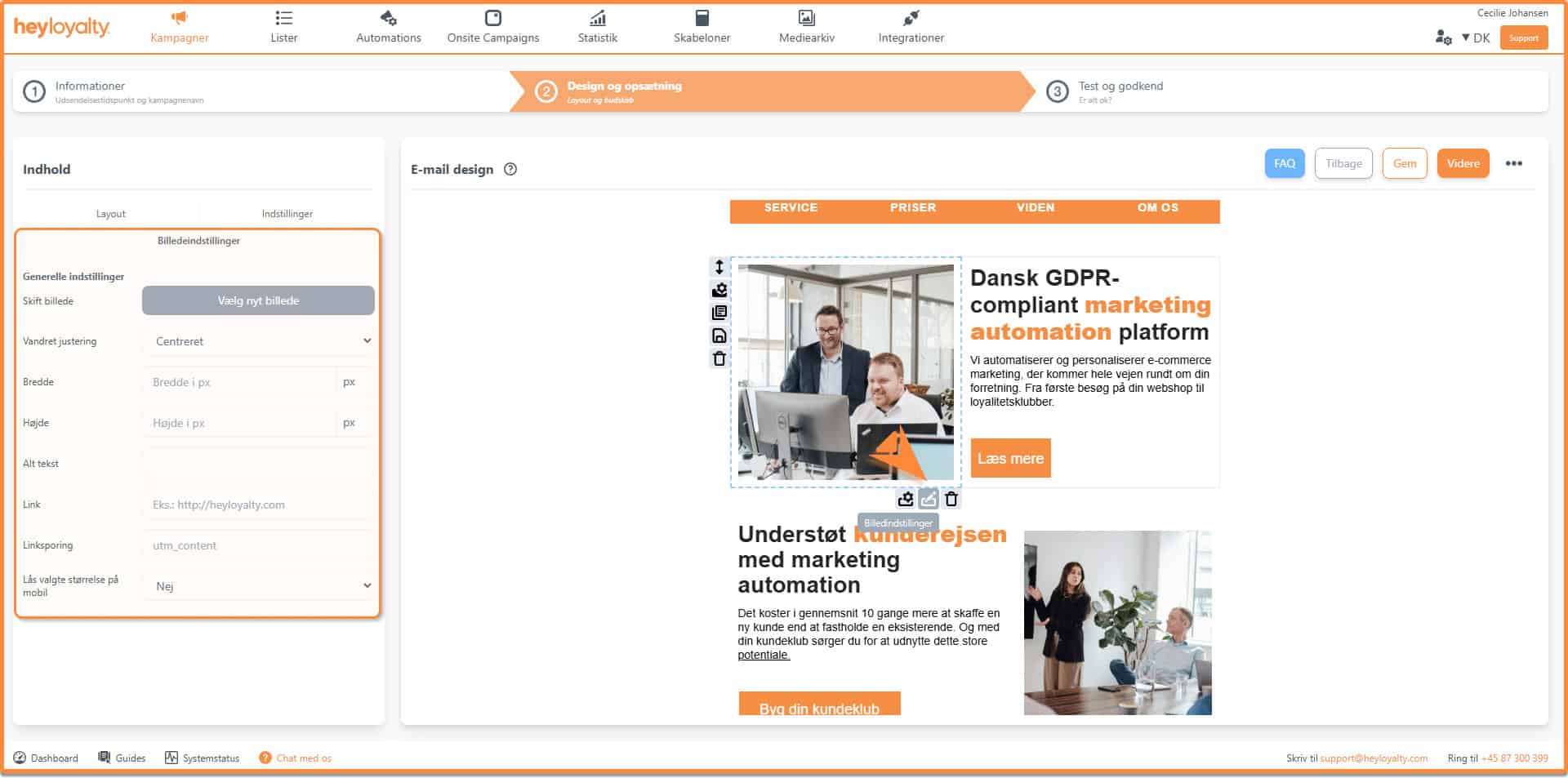 Du kan ændre indstillingerne på billedet ved at føre musen hen over billedet og klikke på billedeindstillinger under billedet, hvorefter du får mulighed for fx at ændre justeringen, størrelsen eller knytte et link til billedet.