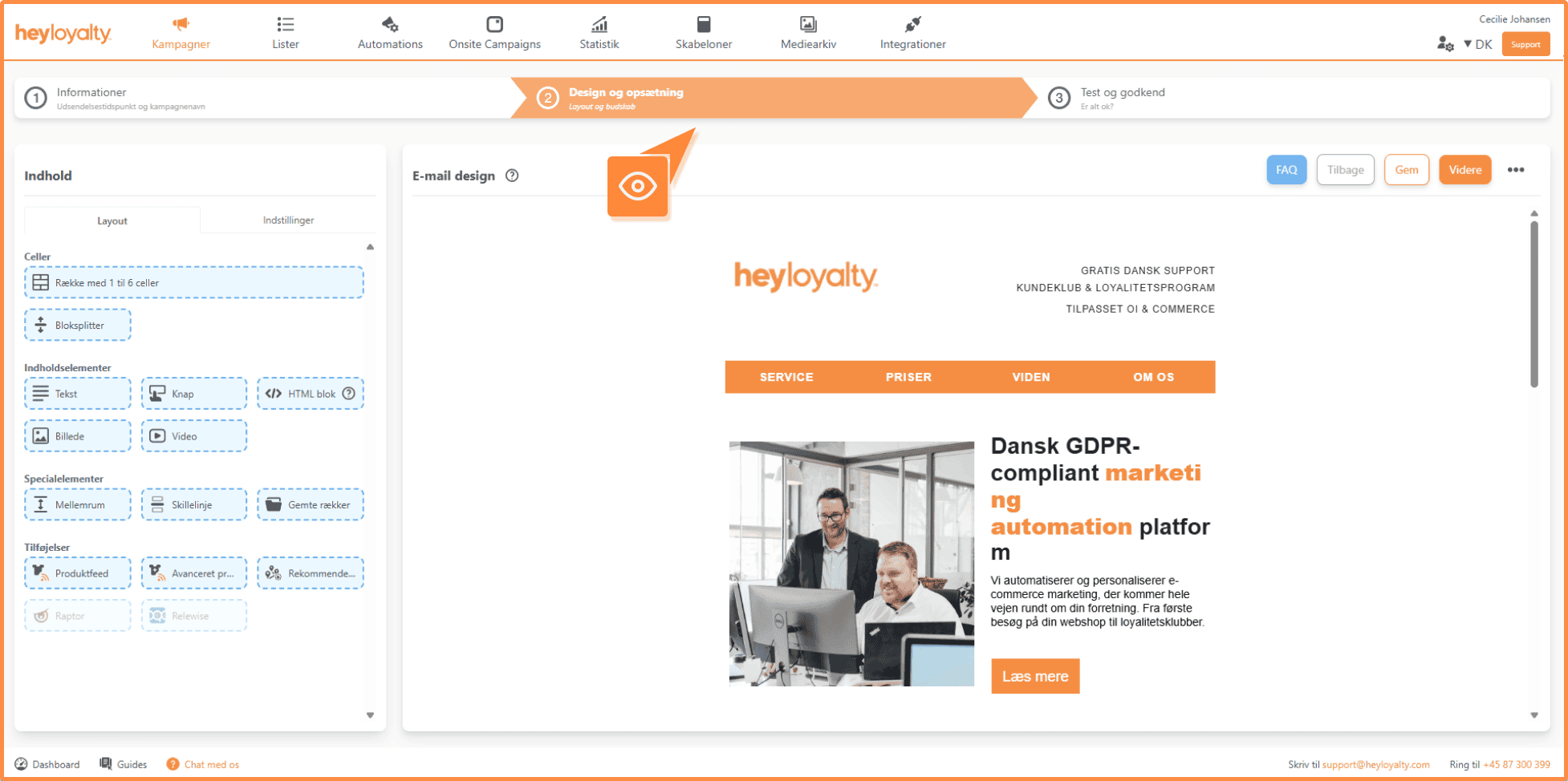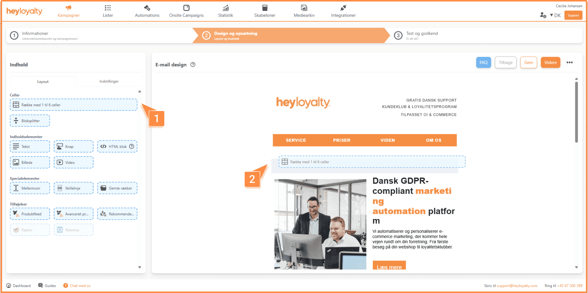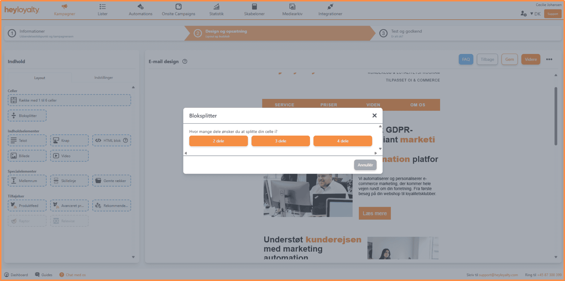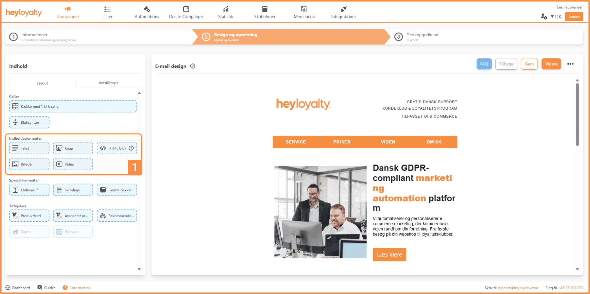 Når du har valgt en skabelon, går du videre til at designe indholdet i din kampagne. Her kan du indsætte celler, indholdselementer, specialelementer og tilføjelser. Samtidig får du et grundlæggende overblik over opsætningen af din kampagne.