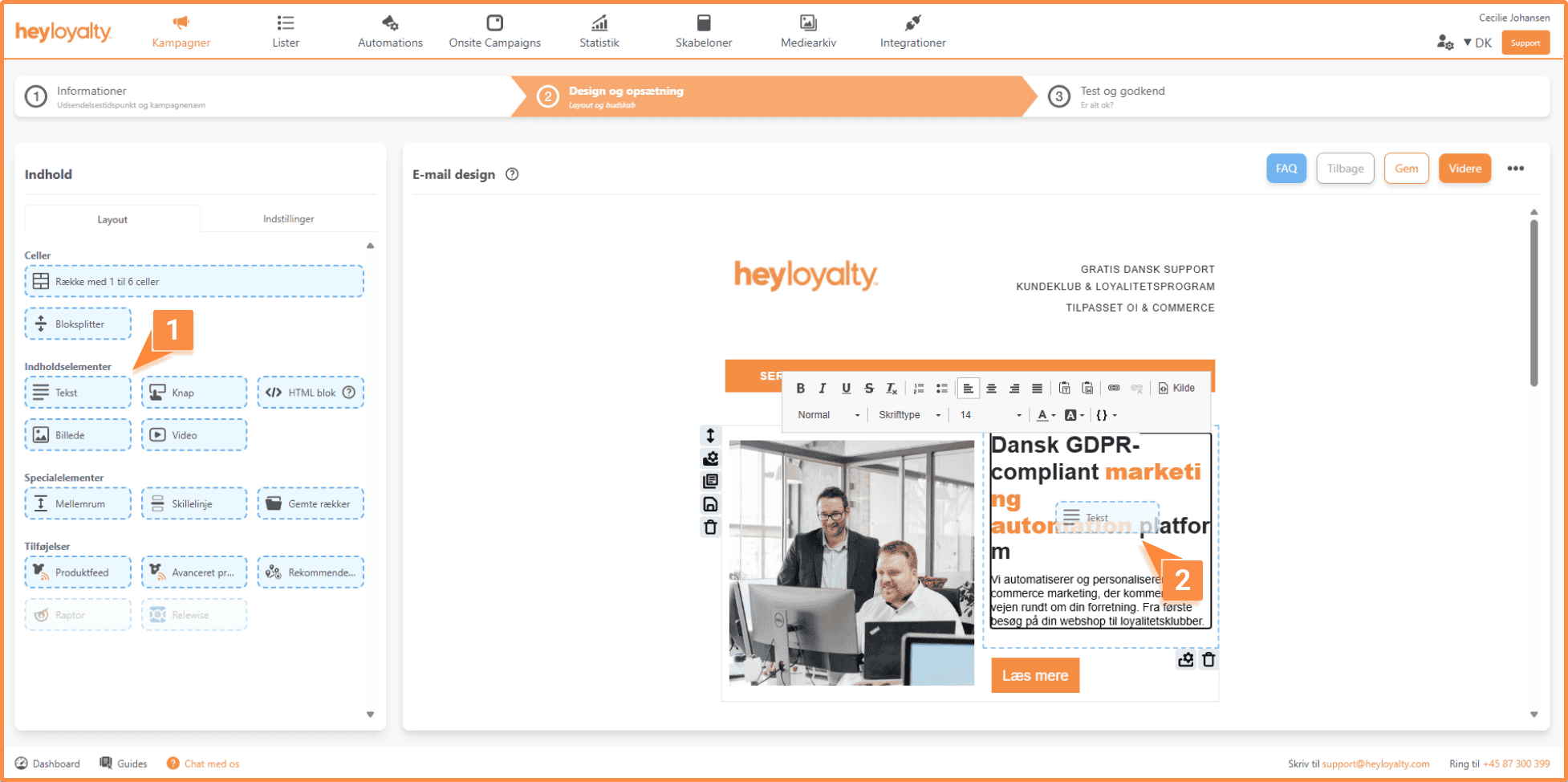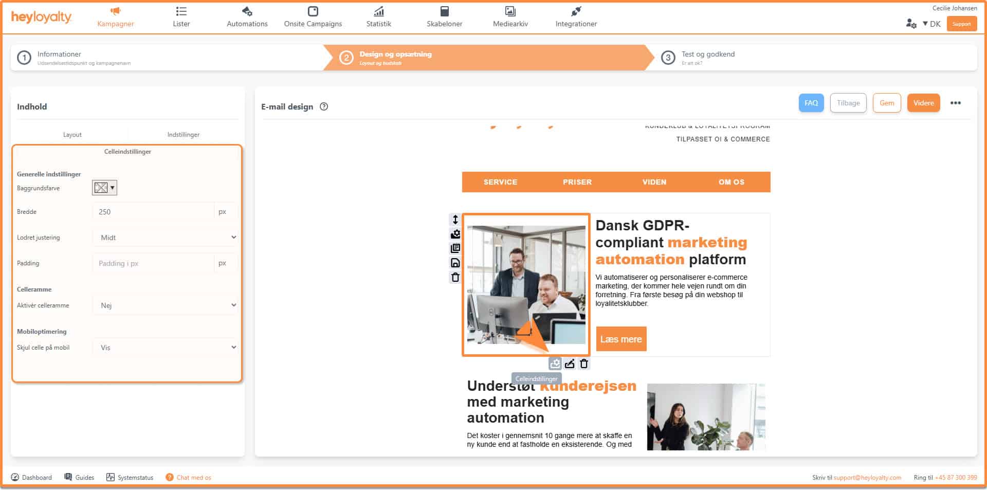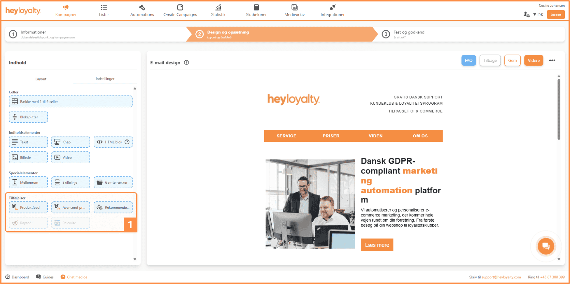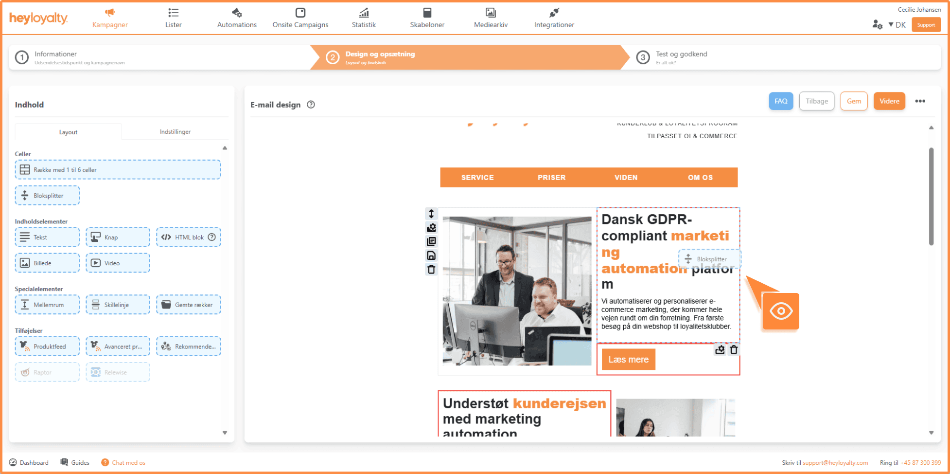 Når du har valgt en skabelon, går du videre til at designe indholdet i din kampagne. Her kan du indsætte celler, indholdselementer, specialelementer og tilføjelser. Samtidig får du et grundlæggende overblik over opsætningen af din kampagne.