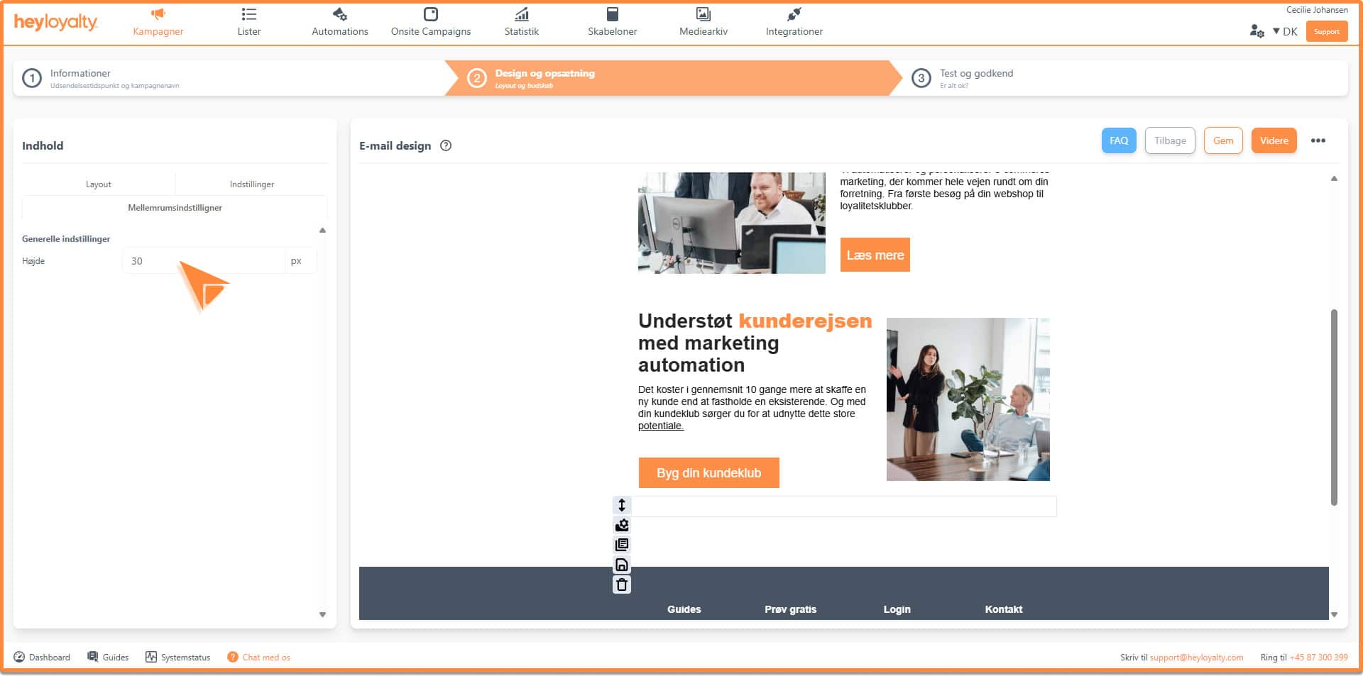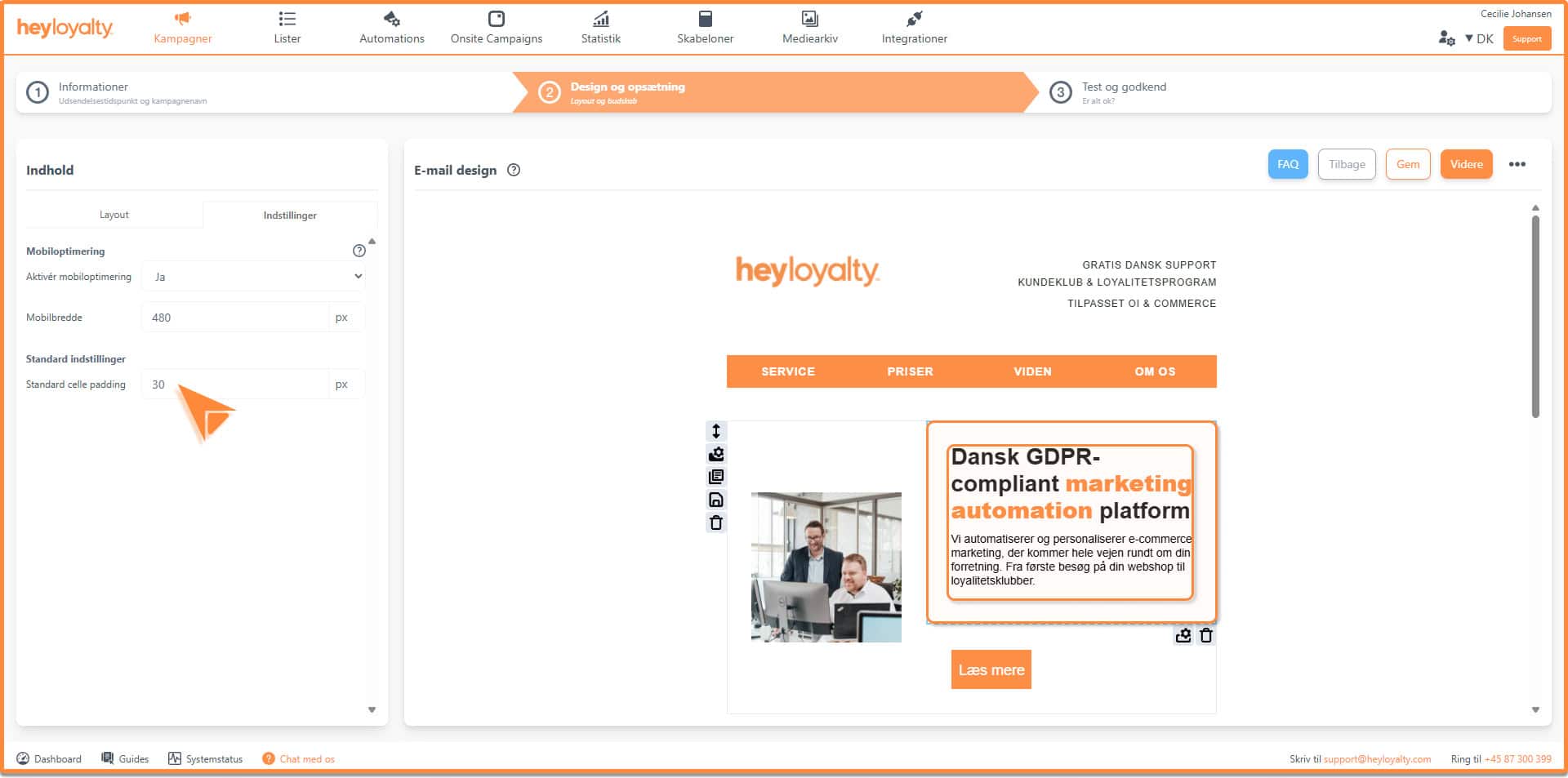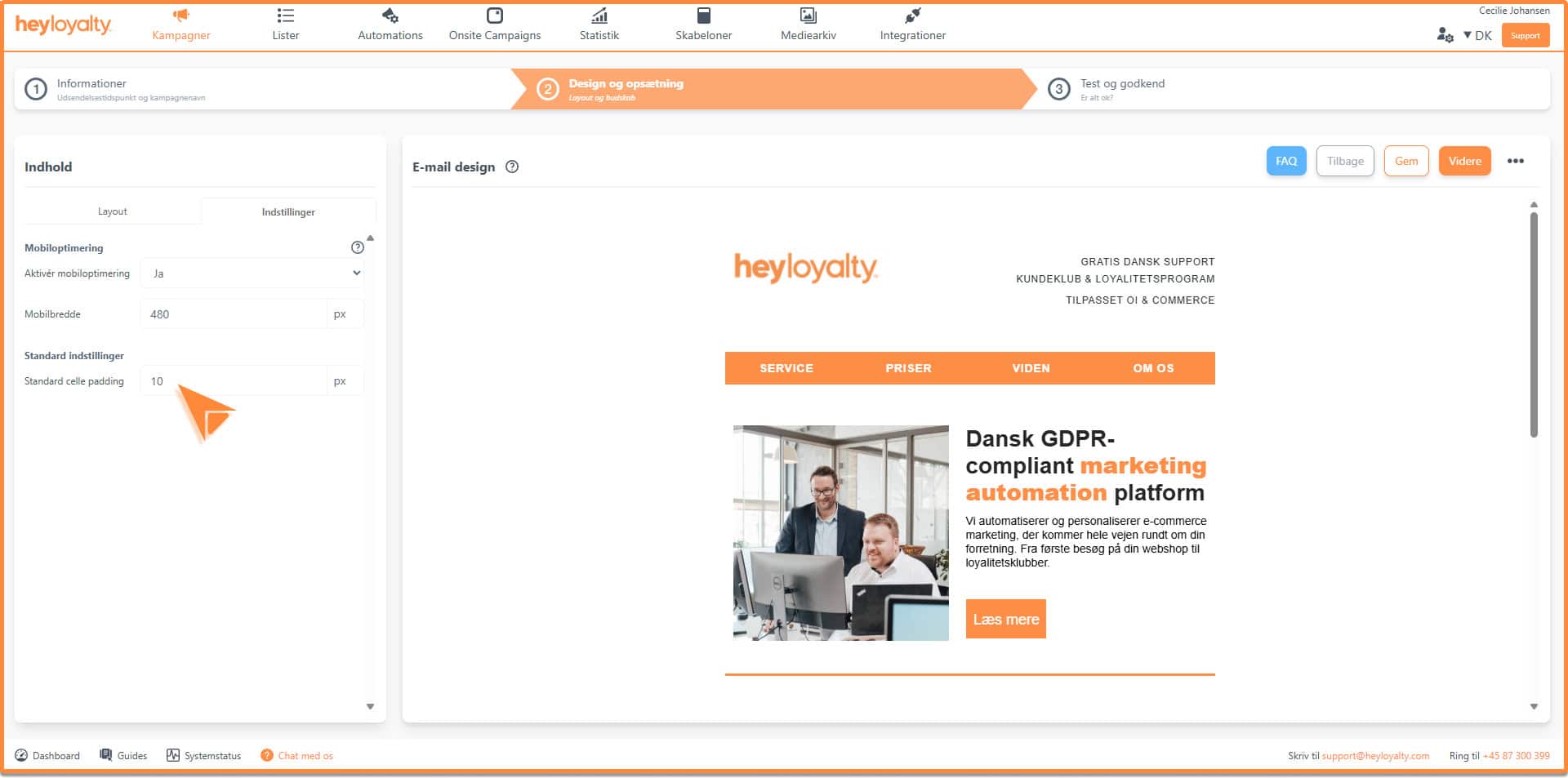 Hvis du gerne vil have overordnet mellemrum (padding) på din kampagne, kan det sættes under indstillinger, som findes her: