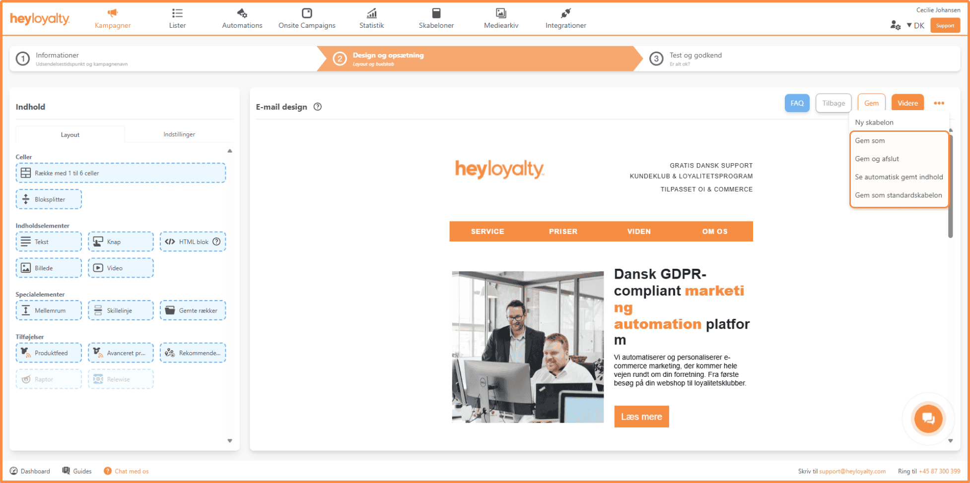 I menuen med de tre prikker, kan du også gemme en standardskabelon, hvor den gemmer alt indhold i din kampagne. Når du gemmer denne standardskabelon, vil du kunne anvende den på kampagner og automationsflows.