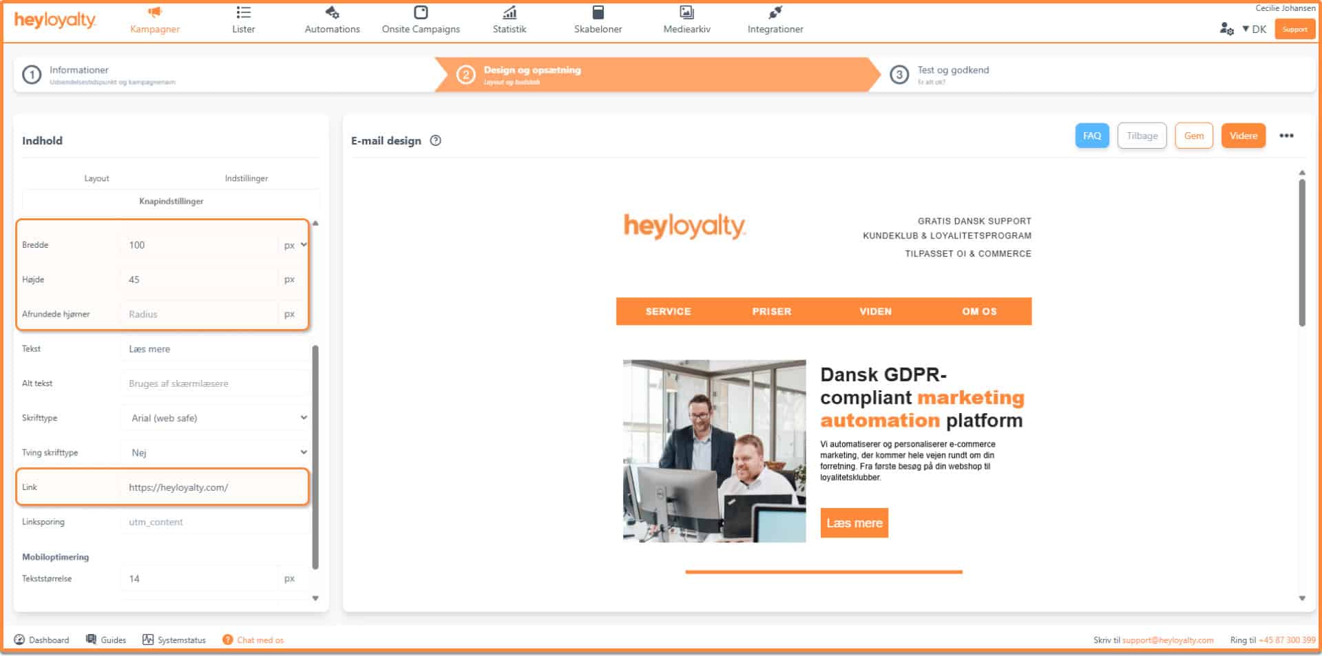 Det er også under knapindstillinger du tilpasser højde/længden på knappen, om der skal være afrunde hjørner. Derudover kan du også indsætte link på knappen her: