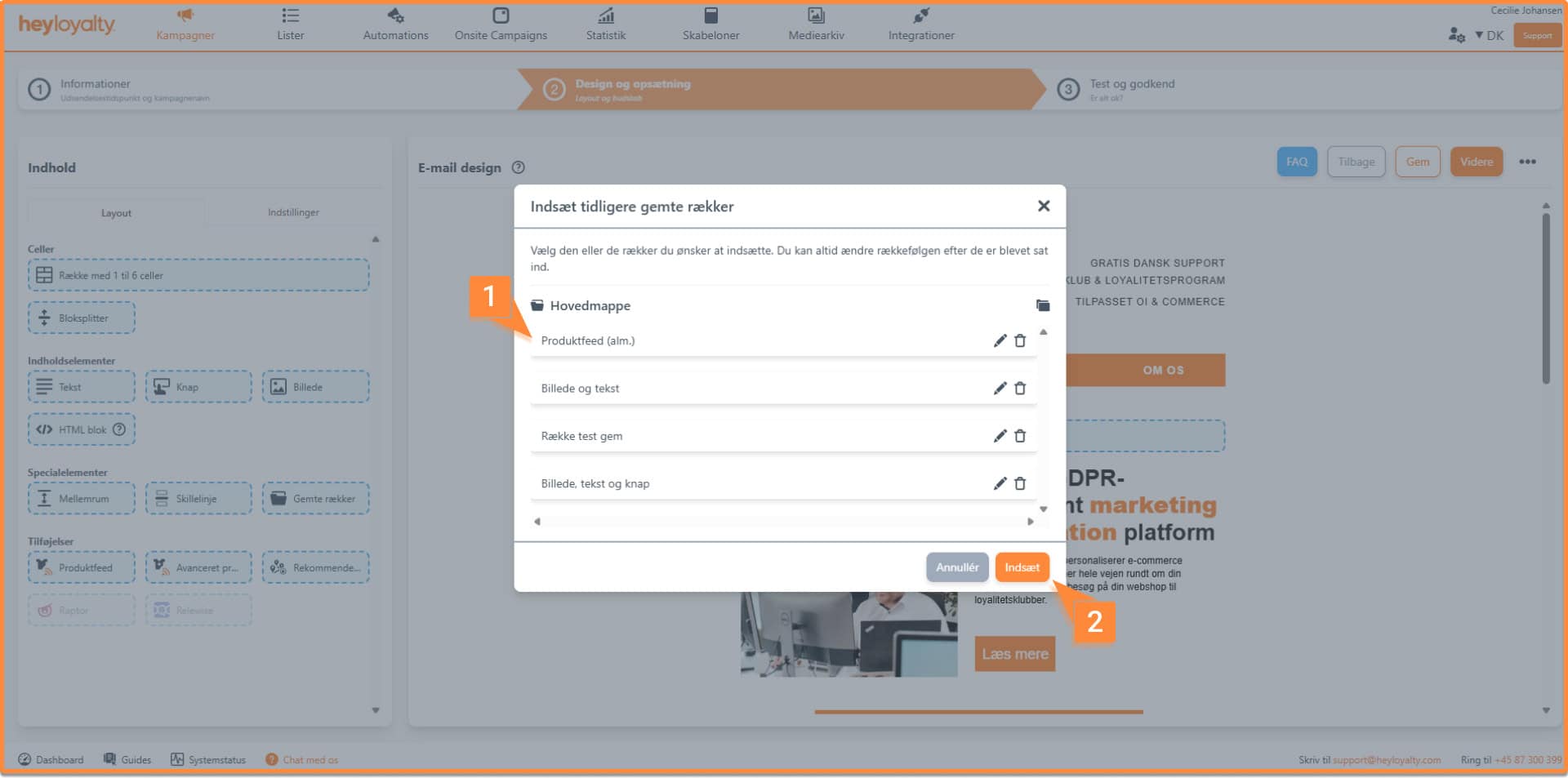 For at se dem, skal du trække blokken ind, der hedder Gemte rækker, hvor du så vil få en popup med en visning af dine gemte rækker og her vælger du den du gerne vil sætte ind i din kampagne.