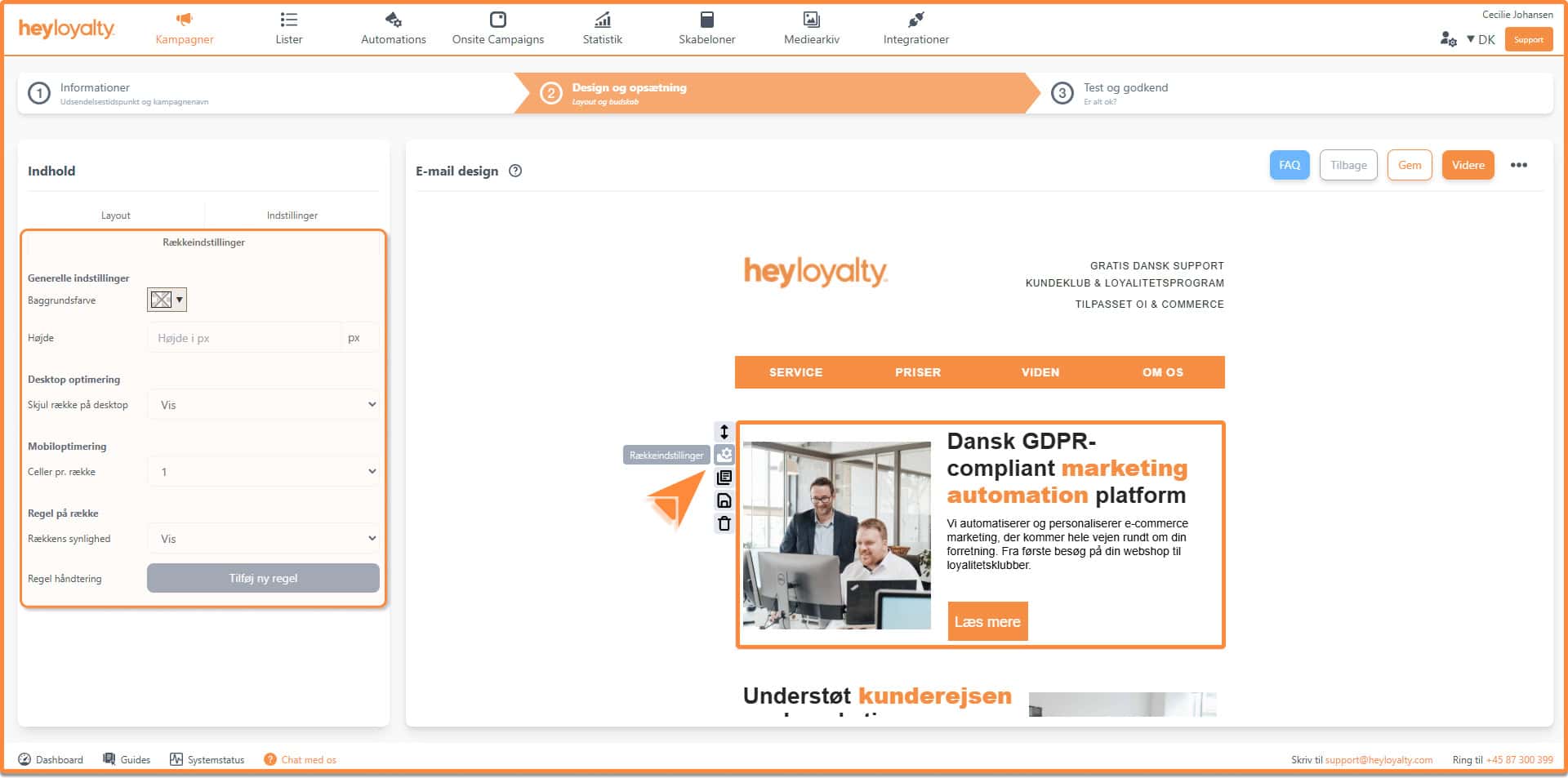 Her kan du ændre rækkens baggrund og højde, vælge om rækken skal vises på desktop samt opsætte regel for rækken. Læs mere om, hvordan du opretter en regel for en række her.