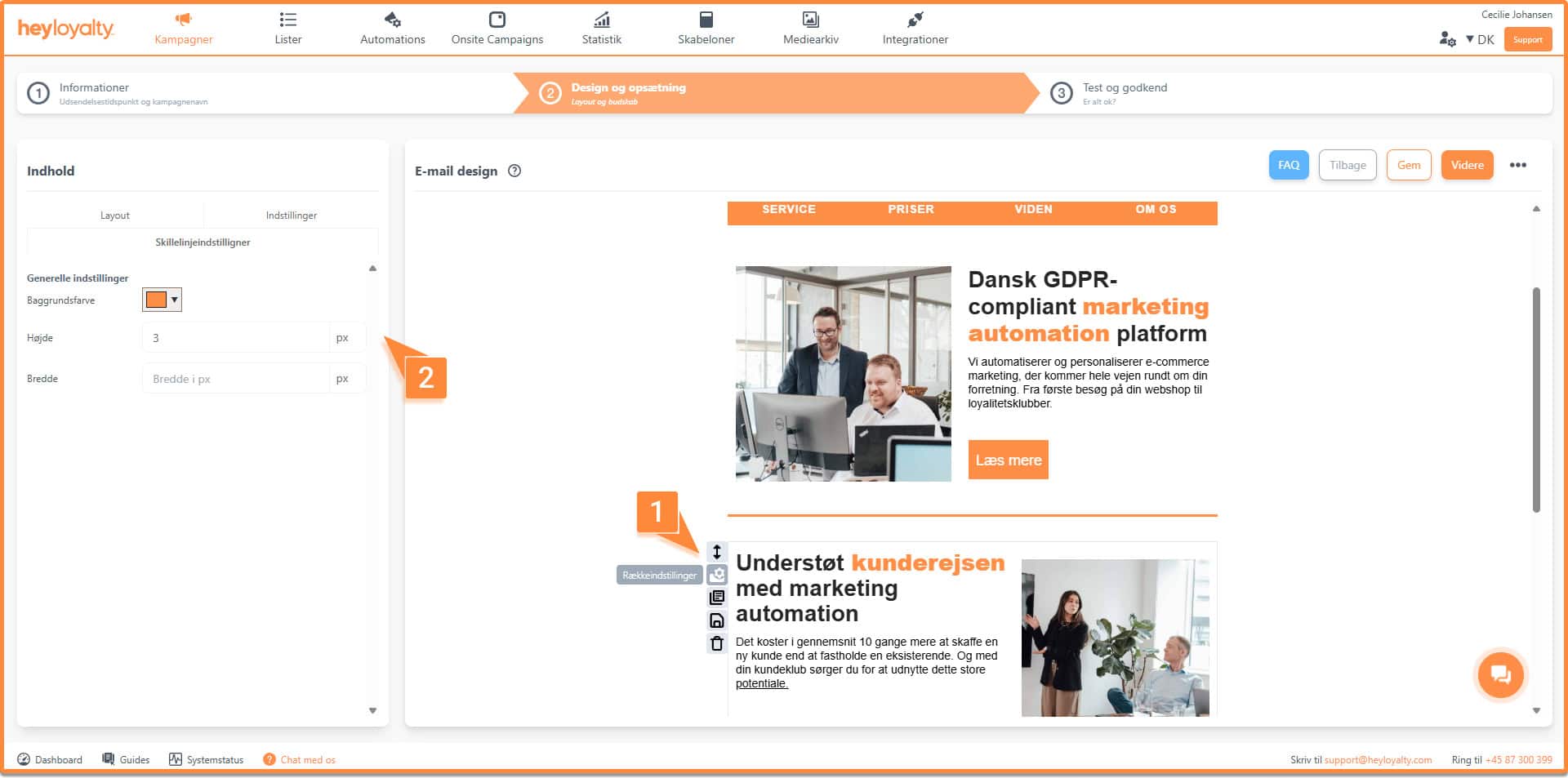 Dette element kan bruges til at indsætte en streg mellem dine rækker, så du kan adskille indholdet i din kampagne. Under indstillingerne kan du tilpasse skillelinjens farve, bredde og længde.